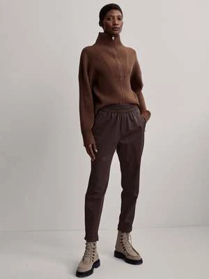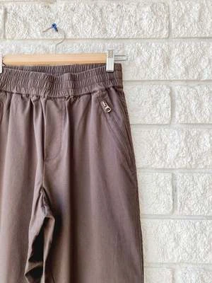 The Varley Marbern Pant 25 in Chocolate Torte boasts a classic, jogger-inspired silhouette featuring turn-up cuffs, zip pockets, and a sumptuous jersey waistband for an unmistakable air of sophistication and comfort.