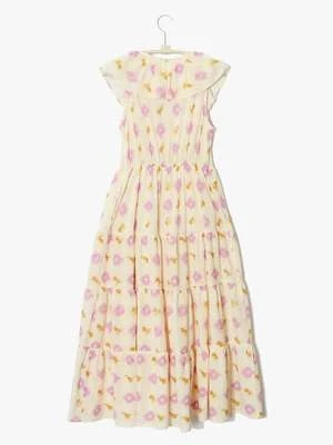 Tatiana is new this season in a cotton gauze ikat print. This tiered midi dress has a ruffled V-neck, an elasticized waist, and side seam pockets.